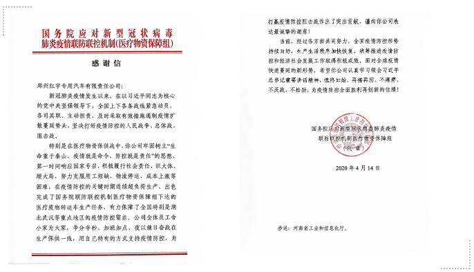 近日,中國兵器工業(yè)集團豫西集團鄭州紅宇專汽公司、一機集團和北重集團分別收到國務院應對新型冠狀病毒肺炎疫情聯(lián)防聯(lián)控機制醫(yī)療物資保障組,包頭市青山區(qū)委、區(qū)政府發(fā)來的感謝信、慰問信,對他們在打贏疫情防控人民戰(zhàn)爭、總體戰(zhàn)、阻擊戰(zhàn)中作出的貢獻表示感謝。 豫西集團鄭州紅宇專汽公司收到國務院聯(lián)防聯(lián)控機制感謝信 4月14日,國務院應對新型冠狀病毒肺炎疫情聯(lián)防聯(lián)控機制醫(yī)療物資保障組向中國兵器工業(yè)集團豫西集團鄭州紅宇專汽公司發(fā)來感謝信。 豫西集團鄭州紅宇專汽公司收到國務院應對新型冠狀病毒肺炎疫情聯(lián)防聯(lián)控機制醫(yī)療物資保障組發(fā)來的感謝信 信中指出,新冠肺炎疫情發(fā)生以來,在以習近平同志為核心的黨中央堅強領(lǐng)導下,全國上下各條戰(zhàn)線緊急動員、各司其職、主動擔責,及時采取有效措施遏制疫情擴散蔓延勢頭,堅決打好疫情防控的人民戰(zhàn)爭、總體戰(zhàn)、阻擊戰(zhàn)。 特別是在醫(yī)療物資保供戰(zhàn)中,鄭州紅宇專汽公司牢固樹立“生命重于泰山、疫情就是命令、防控就是責任”的思想,第一時間響應國家號召,積極履行社會責任,識大體、顧大局,努力克服用工短缺、物流停運、成本上漲等困難,在疫情防控的關(guān)鍵時期連續(xù)超負荷生產(chǎn),出色完成了國務院聯(lián)防聯(lián)控機制醫(yī)療物資保障組下達的醫(yī)療廢物轉(zhuǎn)運車生產(chǎn)任務,有力保障了全國特別是湖北武漢等重點地區(qū)的疫情防控需求。公司全體員工舍小家為大家、爭分奪秒、加班加點,夜以繼日奮戰(zhàn)在生產(chǎn)保供一線,用自己特有的方式支持疫情防控,為打贏疫情防控阻擊戰(zhàn)作出了突出貢獻。 鄭州紅宇專汽公司緊急生產(chǎn)醫(yī)療廢物轉(zhuǎn)運車并及時發(fā)運 疫情發(fā)生以來,鄭州紅宇專汽公司已簽約醫(yī)療廢物轉(zhuǎn)運車107臺,累計下線90臺,交付83臺。 一機集團和北重集團收到中共包頭市青山區(qū)委員會、青山區(qū)人民政府發(fā)來的感謝信和慰問信 4月13日,中共包頭市青山區(qū)委員會、青山區(qū)人民政府向中國兵器工業(yè)集團一機集團和北重集團發(fā)來感謝信和慰問信,對參與青山區(qū)防控疫情一線工作的一機集團、北重集團黨員干部職工及給予充分理解、全力支持的家屬們,表示衷心的感謝并致以最崇高的敬意!
