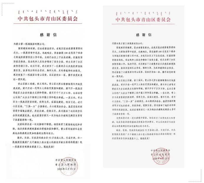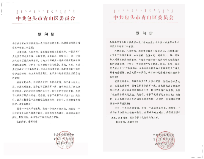 一機集團、北重集團收到中共包頭市青山區(qū)委員會、青山區(qū)人民政府發(fā)來的慰問信 信中指出,在青山區(qū)抗擊疫情最緊要的關(guān)頭,一機集團、北重集團雪中送炭、迅速響應,分別緊急抽調(diào)百余名黨員干部參與到地區(qū)疫情防控工作中,為全區(qū)上下眾志成城,打贏疫情防控的人民戰(zhàn)爭、總體戰(zhàn)、阻擊戰(zhàn)增添了寶貴力量,有力支持了全區(qū)疫情防控工作,彰顯了一機集團、北重集團在公共危機面前挺膺負責、挺身而出的社會責任,胸懷大局、無私奉獻的社會擔當。 一機集團黨員干部馳援青山區(qū)疫情防控一線 北重集團黨員干部馳援青山區(qū)疫情防控一線 來源/豫西集團紅宇專汽公司、一機集團、北重集團