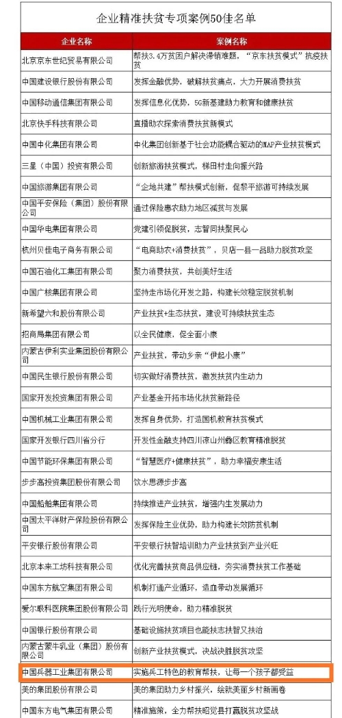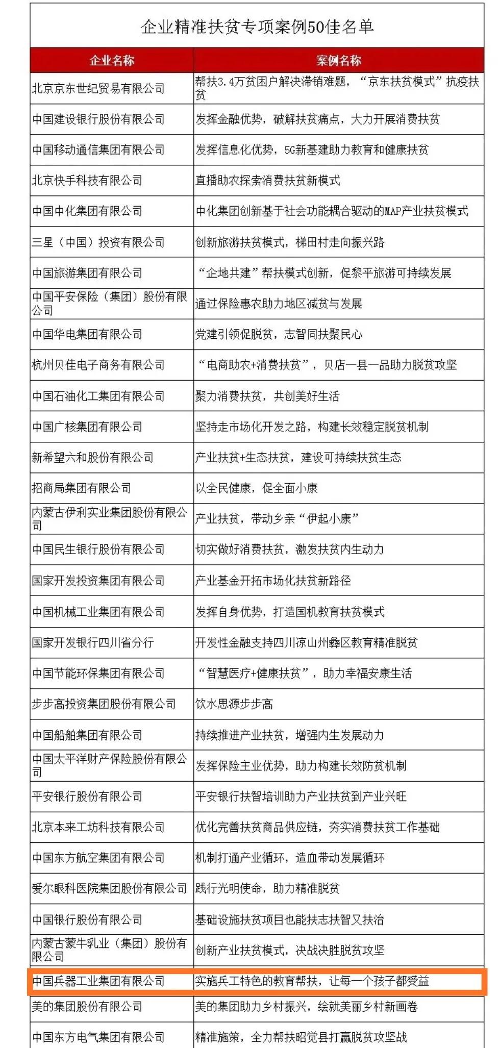 近日,國務(wù)院扶貧辦發(fā)布2020年企業(yè)精準(zhǔn)扶貧案例獲獎名單,中國兵器工業(yè)集團(tuán)有限公司《實(shí)施兵工特色的教育幫扶,讓每一個孩子都受益》案例入選2020年企業(yè)精準(zhǔn)扶貧專項(xiàng)案例“50佳”。