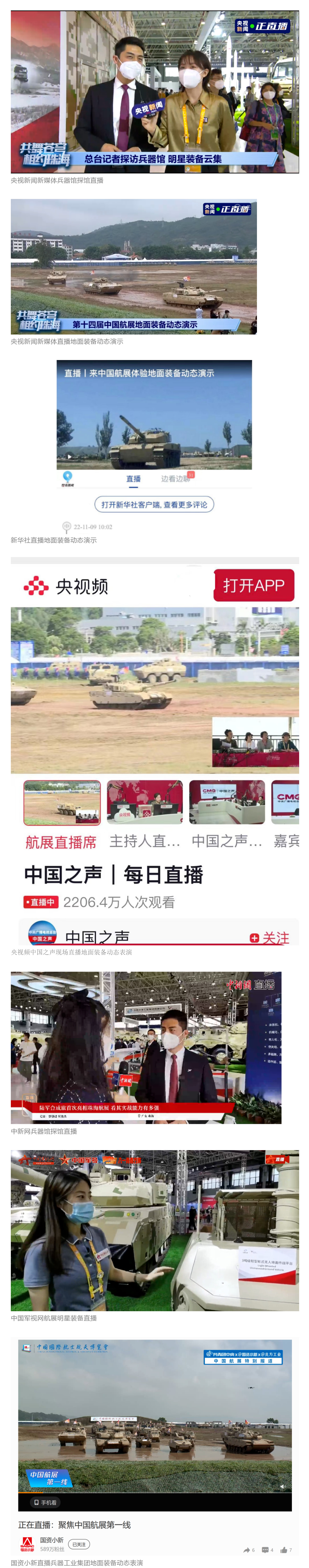 央視新聞新媒體、央視頻中國之聲、新華社、中國新聞網(wǎng)、中國軍視網(wǎng)、CGTN(微博、臉書、推特)等媒體以及國資小新、共青團(tuán)中央、鳳凰軍事等到兵器工業(yè)集團(tuán)地面動(dòng)態(tài)演示區(qū)、中國兵器館進(jìn)行了直播。航展期間,集團(tuán)公司微信視頻號(hào)、微博、抖音號(hào)、快手號(hào)共進(jìn)行8次直播,最高觀看人數(shù)突破24萬。