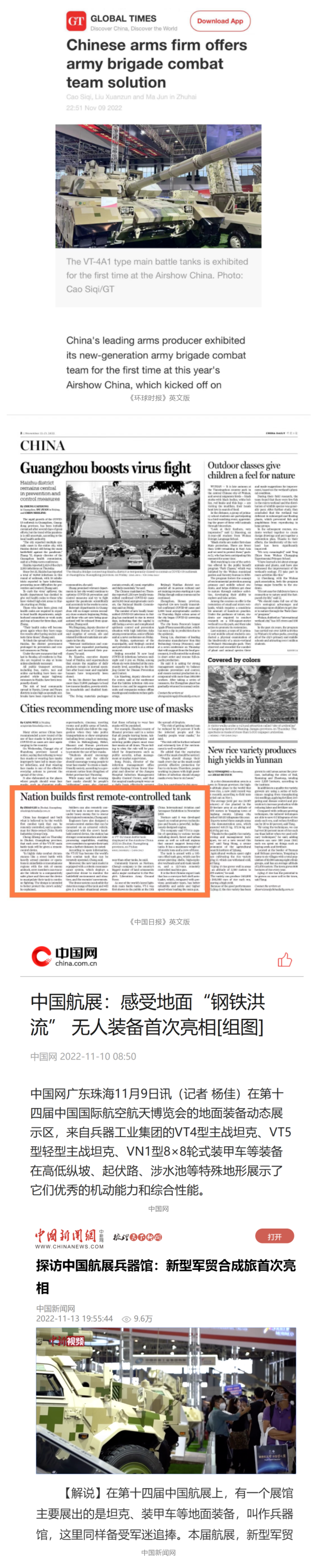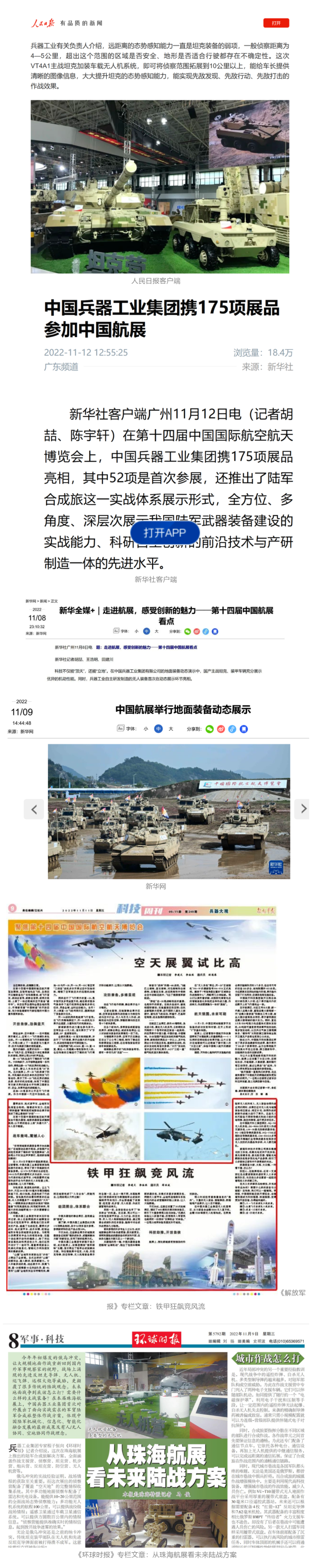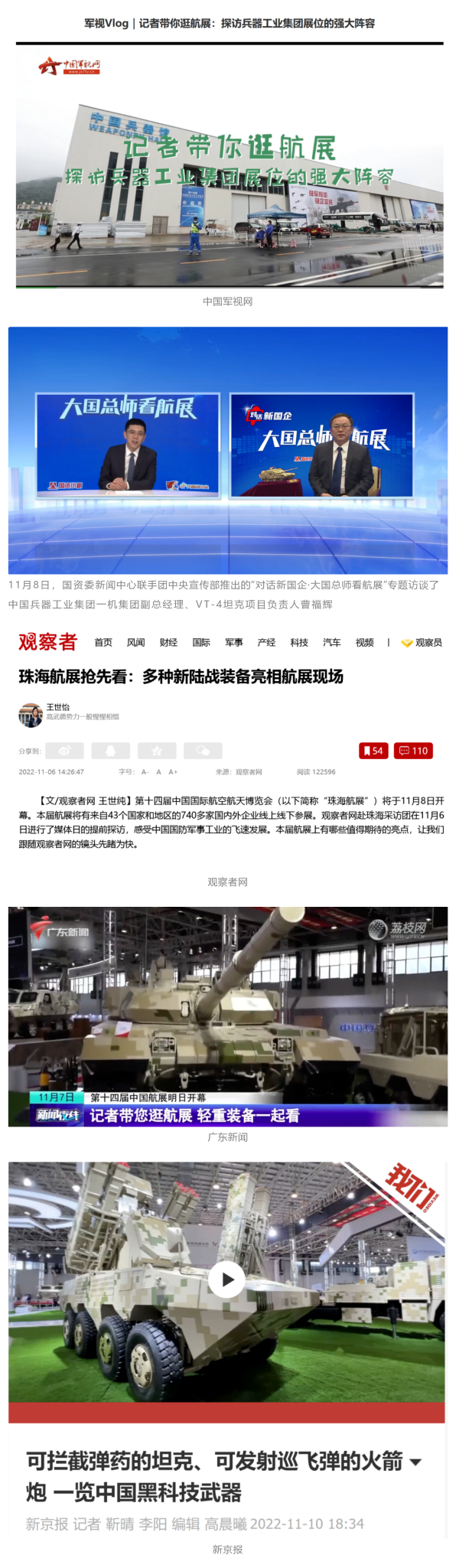 央視國防軍事頻道航展特別報(bào)道《炫舞天地間》11月12日《賞“鐵甲雄風(fēng)”!看航展地面裝備“鋼鐵洪流”名場面》對(duì)兵器工業(yè)集團(tuán)武器裝備特色亮點(diǎn)進(jìn)行報(bào)道?!秶儡娛略鐖?bào)》11月7日推出報(bào)道《第十四屆中國國際航空航天博覽會(huì)明天開幕 中國兵器館首次以陸軍合成旅實(shí)戰(zhàn)體系形式展出》,對(duì)兵器館陸軍合成旅實(shí)戰(zhàn)體系進(jìn)行報(bào)道?!盾娛聢?bào)道》11月9日推出《第十四屆中國國際航空航天博覽會(huì) 地面兵器裝備首次聯(lián)合陸航直升機(jī)進(jìn)行動(dòng)態(tài)展示》報(bào)道?!盾娒孕刑煜隆?1月9日推出報(bào)道《軍迷打卡航展2022》以專業(yè)軍迷視角探館兵器館,全面展示兵器工業(yè)集團(tuán)參展裝備特色亮點(diǎn)。