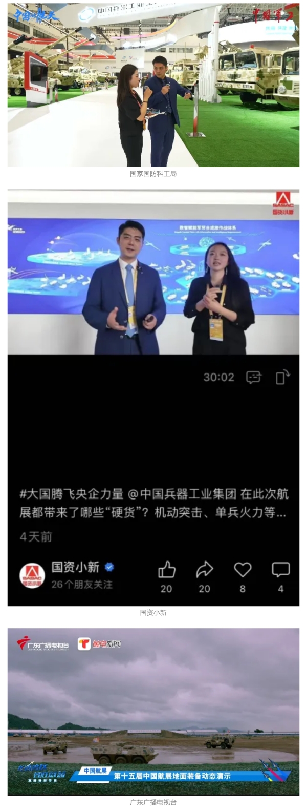 新華社、央視新聞、中央廣播電視總臺(tái)中國(guó)之聲、央視軍事、中國(guó)軍視網(wǎng)、廣東廣播電視臺(tái)等媒體以及國(guó)家國(guó)防科工局、國(guó)資小新等到兵器工業(yè)集團(tuán)地面動(dòng)態(tài)演示區(qū)、中國(guó)兵器館進(jìn)行了直播。