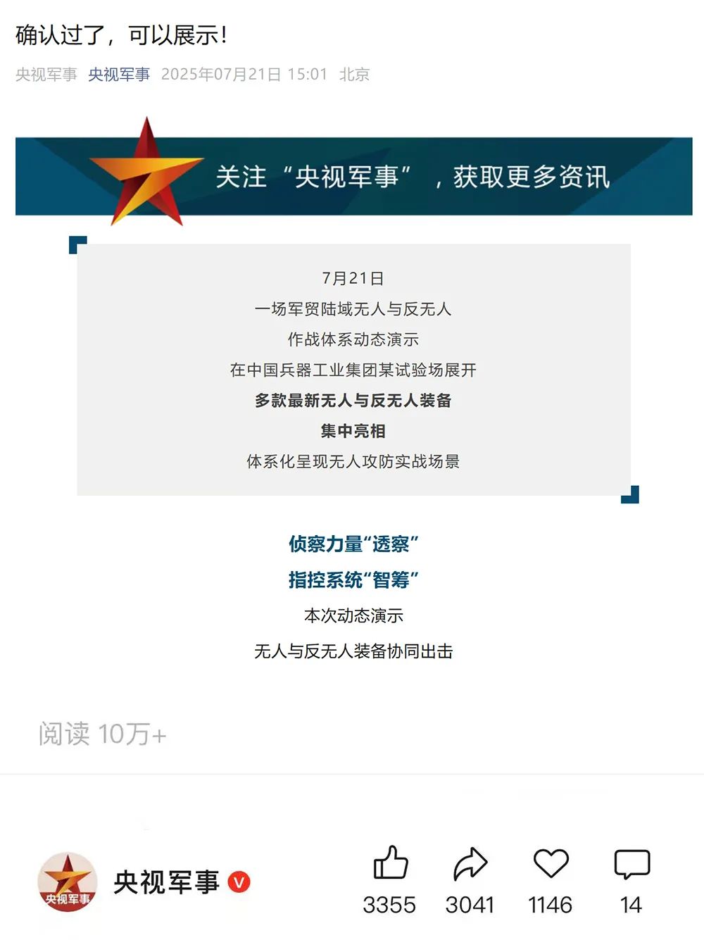 7月21日,中國兵器工業(yè)集團有限公司在位于內蒙古的某試驗場舉辦軍貿陸域無人與反無人作戰(zhàn)體系主題日活動,攜無人機、巡飛彈、反無人機等最新武器裝備登場亮相,展現(xiàn)了一場無人與反無人領域激烈對抗的實戰(zhàn)場景。中央主流媒體、地方媒體、知名網(wǎng)絡媒體,以及集團公司各宣傳平臺紛紛進行報道,多次登上熱搜,引發(fā)廣泛關注。 央視新聞頻道《新聞直播間》《東方時空》《24小時》、國防軍事頻道《正午國防軍事》《軍事報道》《國防軍事早報》、中文國際頻道《今日環(huán)球》、央視軍事新媒體等報道了集團公司軍貿陸域無人與反無人作戰(zhàn)體系首次公開實裝動態(tài)演示有關情況,重點介紹了無人與反無人作戰(zhàn)最新裝備。 央視新聞頻道《新聞直播間》:內蒙古 軍貿陸域無人與反無人作戰(zhàn)最新裝備亮相 央視新聞頻道《新聞直播間》:內蒙古 軍貿陸域無人與反無人作戰(zhàn)最新裝備亮相 記者探訪無人裝備展區(qū) 央視新聞頻道《新聞直播間》:軍貿陸域無人與反無人作戰(zhàn)最新裝備亮相·記者探訪 最強“盾牌” 反無人機系統(tǒng)新升級 人民日報微博、央視軍事微博、央視新聞客戶端、中國新聞網(wǎng)、中新社國是直通車抖音、環(huán)球網(wǎng)微博、環(huán)球時報(X平臺、英文版客戶端)、中國日報網(wǎng)、央視軍事報道微博、中國軍號微博、中央廣播電視總臺“空天逐夢”微信視頻號、共青團中央B站、國資小新微博等中央主流媒體、國家部委的新媒體播發(fā)集團公司陸域無人與反無人作戰(zhàn)大片等視頻作品。 人民日報微博 央視軍事微博 人民日報、新華網(wǎng)、央視軍事、央視新聞、中央廣播電視總臺中國之聲、中國新聞網(wǎng)、中國日報網(wǎng)、中國日報英文報刊《CHINA DAILY》、《科技日報》、光明日報客戶端、環(huán)球網(wǎng)、環(huán)球時報、人民日報海外版-海外網(wǎng)、央視網(wǎng)、小央視頻、參考消息、瞭望東方周刊、共青團中央、國資小新新媒體、新浪網(wǎng)、騰訊網(wǎng)、搜狐網(wǎng)、鳳凰網(wǎng)、網(wǎng)易網(wǎng)等中央主流媒體、國家部委的新媒體及知名網(wǎng)絡媒體對集團公司軍貿陸域無人與反無人作戰(zhàn)體系主題日活動進行了圖文、音頻、視頻報道。 央視軍事微信 人民日報微信 新華網(wǎng)微信 來源/各主流媒體 |